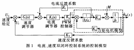 由于系統(tǒng)力矩波動(dòng)的影響,直流力矩電機(jī)的電樞電流會(huì)產(chǎn)生波動(dòng),在速度環(huán)中加入電流環(huán)增加系統(tǒng)的阻尼以抑制電樞電流的波動(dòng)。系統(tǒng)電流環(huán)的帶寬應(yīng)為速度環(huán)帶寬的5-10倍,這樣電流內(nèi)環(huán)才能起到快速調(diào)節(jié)電流的作用,改善速度輸出的平穩(wěn)性。電流、速度閉環(huán)控制系統(tǒng)的模型如圖1所示。